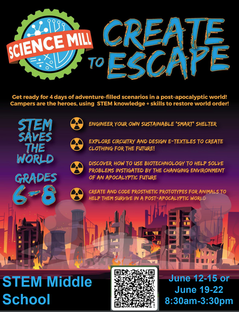Get ready for 4 days of adventure-filled scenarios in a post-apocalyptic world! Campers are the heroes, using STEM knowledge + skills to restore world order!